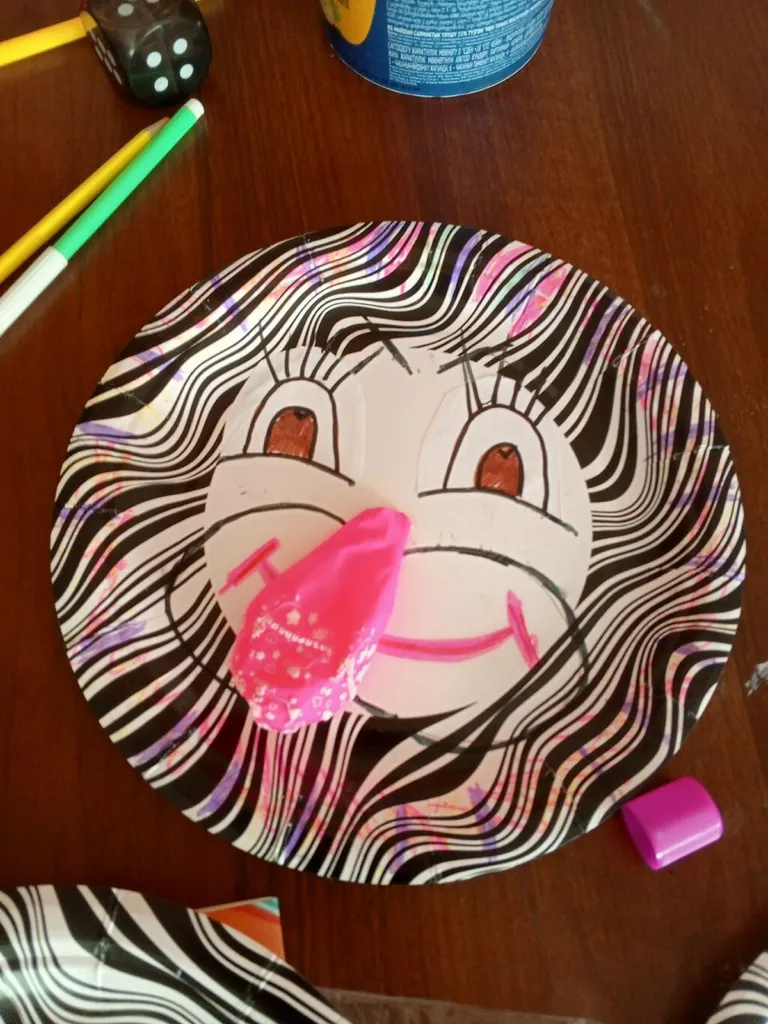 Одноразовые тарелки превратились в круглые, улыбающиеся лица клоунов, а разноцветные воздушные шары -в пышные носы. Каждый клоун